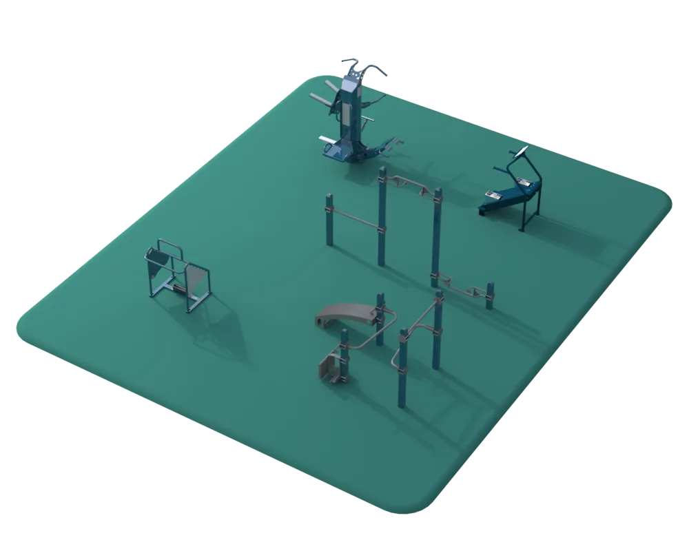 The Premium Plus Fitness Package is an outdoor gym that provides biomechanically correct cardio, strength, and flexibility exercises in a low-maintenance and ASTM F3101-21 compliant package. The Premium Plus Fitness Package features the Helios Multigym, the Flex Multi-Stretch and the Everest Cardio Climber with the addition of Cali-Rig 16 and Cali-Rig 25.